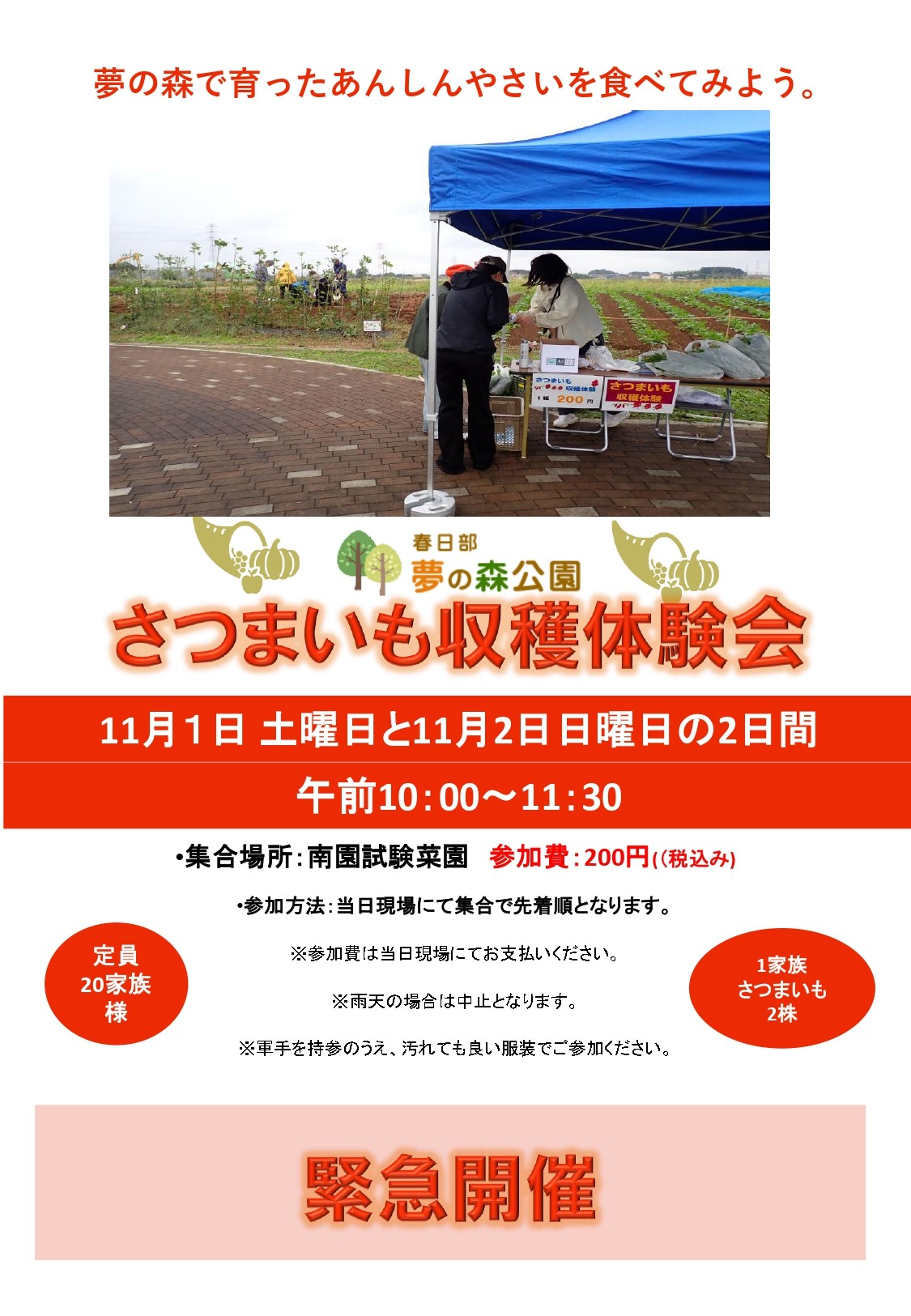 11/1(土)・11/2(日)さつまいも収穫体験会を開催します。