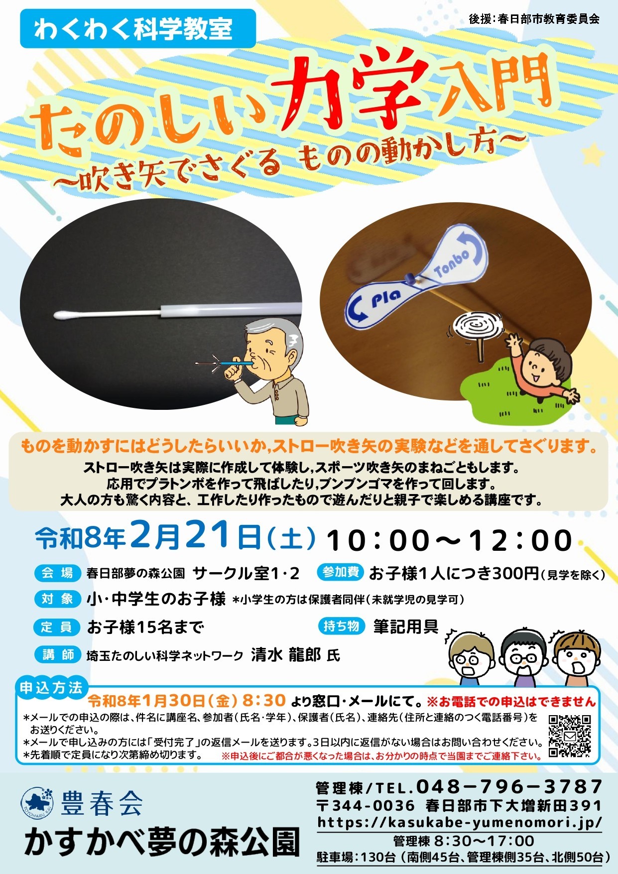 【開催】わくわく科学教室 2026年1月10日 最終更新日時 : 2026年1月10日 kasukabe 2026年2月21日(土)開催! 「わくわく科学教室」たのしい力学入門~吹き矢でさぐる ものの動かし方~ 詳しくはチラシをご覧ください。