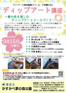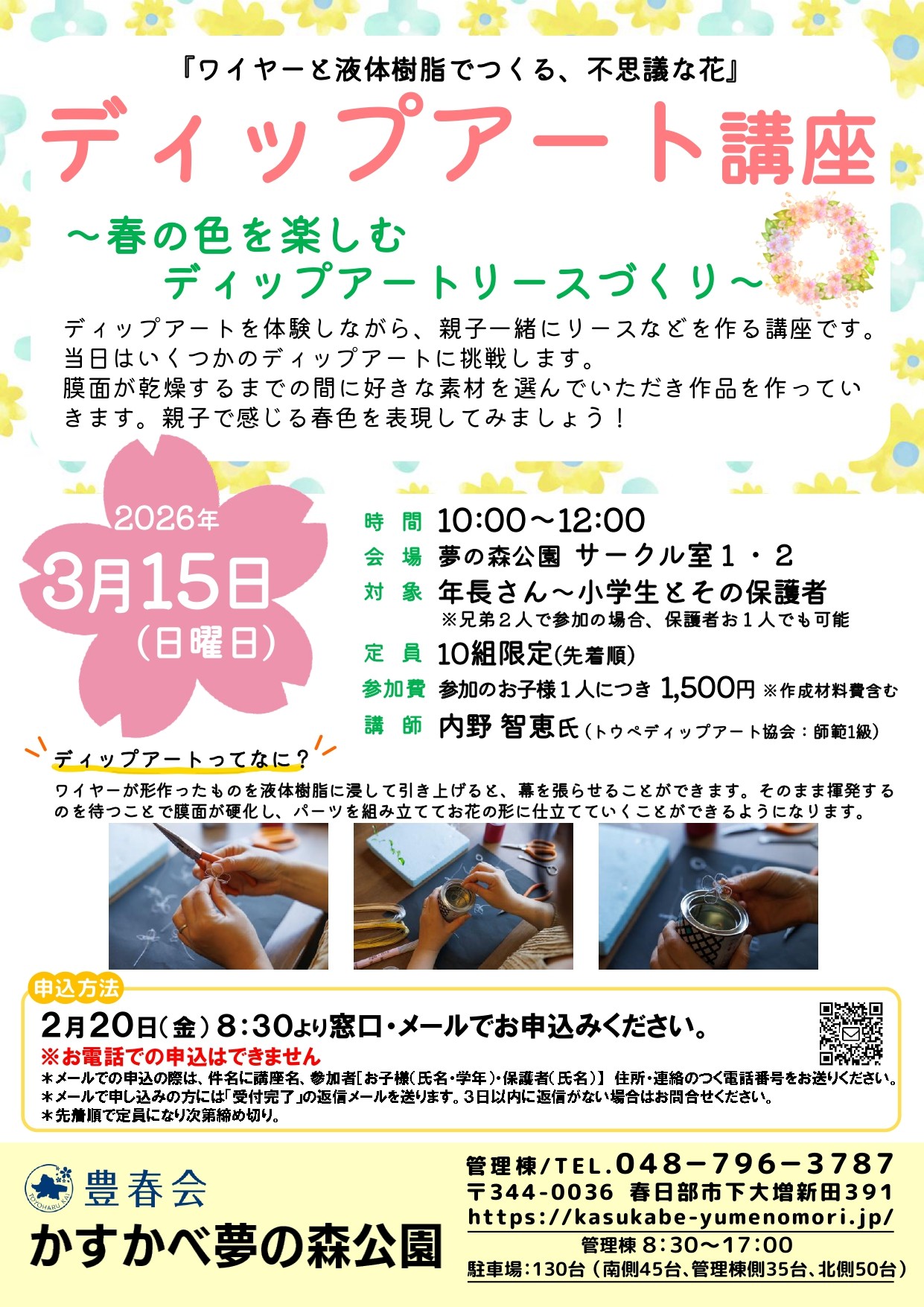【開催】ディップアート講座 2026年2月3日 最終更新日時 : 2026年2月3日 kasukabe 3/15(日) 開催!『ワイヤーと液体樹脂でつくる、不思議な花』 ディップアート講座 ~春の色を楽しむディップアートリースづくり~ 詳しくはチラシをご覧ください。