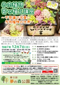11/17(月)受付開始「多肉植物寄せ植え講座」 2025年11月3日 最終更新日時 : 2025年11月3日 kasukabe 12/7(日) 2回開催! 「多肉植物寄せ植え講座」~不思議で可愛い多肉植物の世界~ 詳しくはチラシをご覧ください。