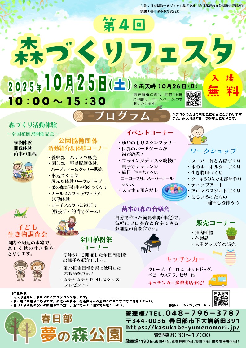 森づくり活動体験、全国植樹祭コーナー、ワークショップ、子ども生き物調査会、苗木の森の音楽会、公園協働団体の活動体験や展示発表、物販、キッチンカー出店 等